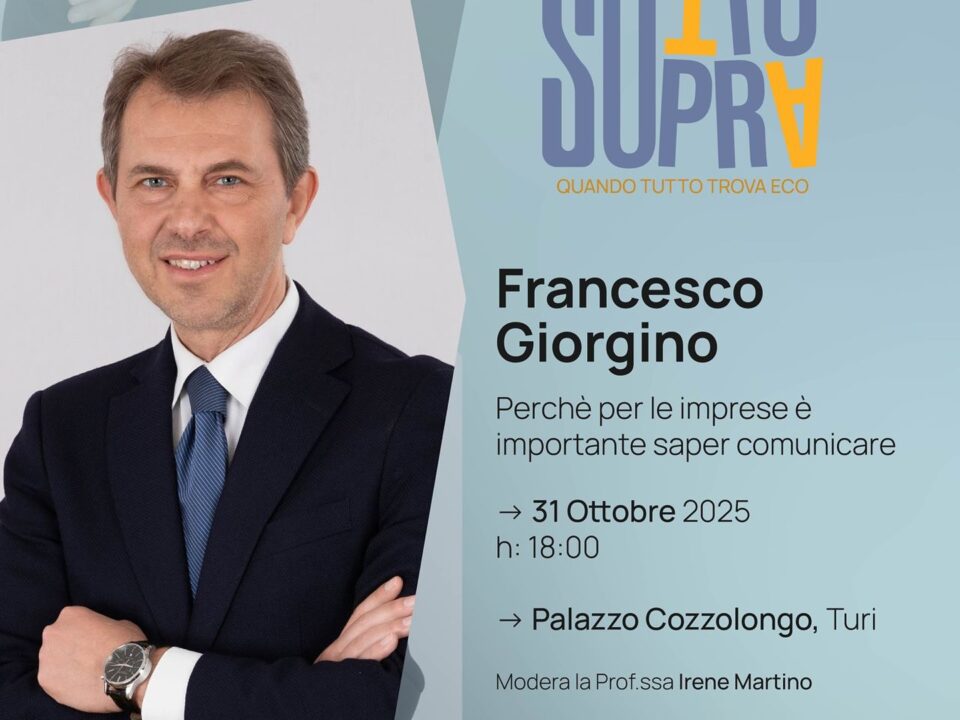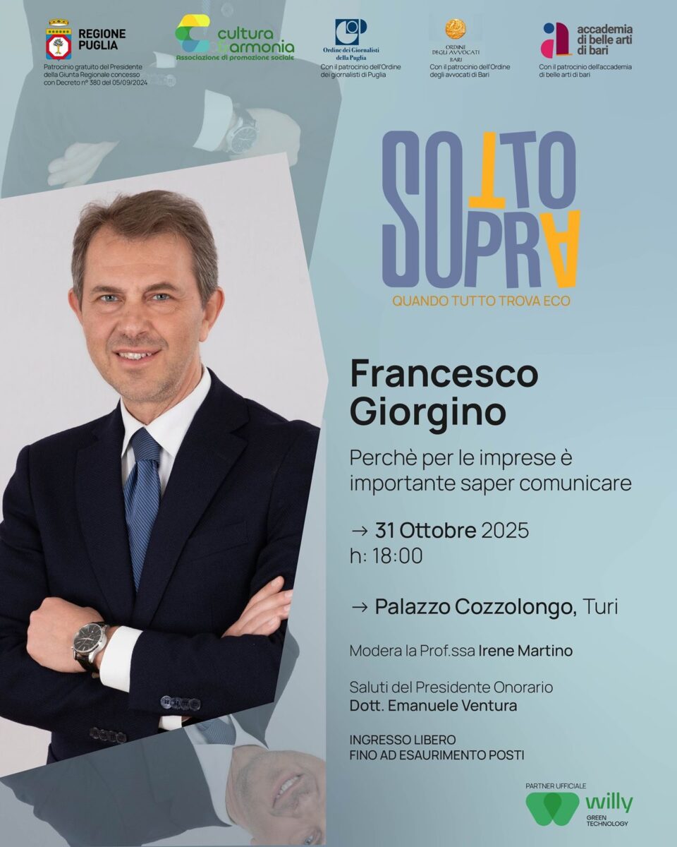 24 Ottobre 2025Prende il via la rassegna SOTTOSOPRA – Quando tutto trova eco, promossa da Cultura & Armonia APS con il patrocinio della Regione Puglia, dell’Ordine dei Giornalisti della Puglia, dell’Ordine degli Avvocati di Bari e dell’Accademia di Belle Arti di Bari.L’apertura è affidata all’incontro “L’arte della parola – parte 1”, in programma venerdì 17 ottobre 2025 alle ore 18:00 presso Palazzo Cozzolongo a Turi.Protagonisti della serata saranno la Dott.ssa Maria Pia Iurlaro, psicolinguista, esperta in comunicazione e coaching, e Claudio Popolizio, doppiatore con una lunga esperienza nel doppiaggio di film e pubblicità. Un dialogo vivo e coinvolgente che esplorerà il potere della voce, la forza del linguaggio e la consapevolezza che nasce dall’uso autentico della parola. Attraverso esempi, esercizi e momenti di interazione con il pubblico, l’incontro inviterà a riscoprire la parola come strumento di espressione, connessione e crescita personale.I saluti istituzionali saranno affidati al Presidente Onorario Dott. Emanuele Ventura.Con questo primo appuntamento, la rassegna SOTTOSOPRA apre un percorso che intreccia arte, letteratura, linguaggio e introspezione, offrendo esperienze che fanno “trovare eco” a emozioni e pensieri.